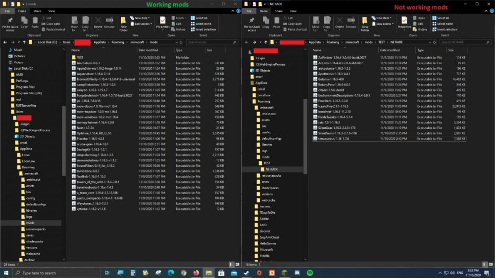 Hello, I have some mods that just wont work with latest Forge 1.16.4-forge-35.0.7 version. Is there any reason or idea why they wont work? All mods are downloaded with latest 1.16.4 versions on their download page and it says they work with latest version of the game/forge. Things i did: I run normal vanilla minecraft, Than exit and Installed Forge, Run Forge instance for minecraft, Than exit and started adding mods. Adding mods one by one to filter non working ones. The error with some mods i am getting is : Game Crashed an unexpected issue occurred and the game has crashed. Exit Code: 0 Ill attach the list of mods, on left side are mods that are working, on the left side are mods that wont work and game crash if i add them.