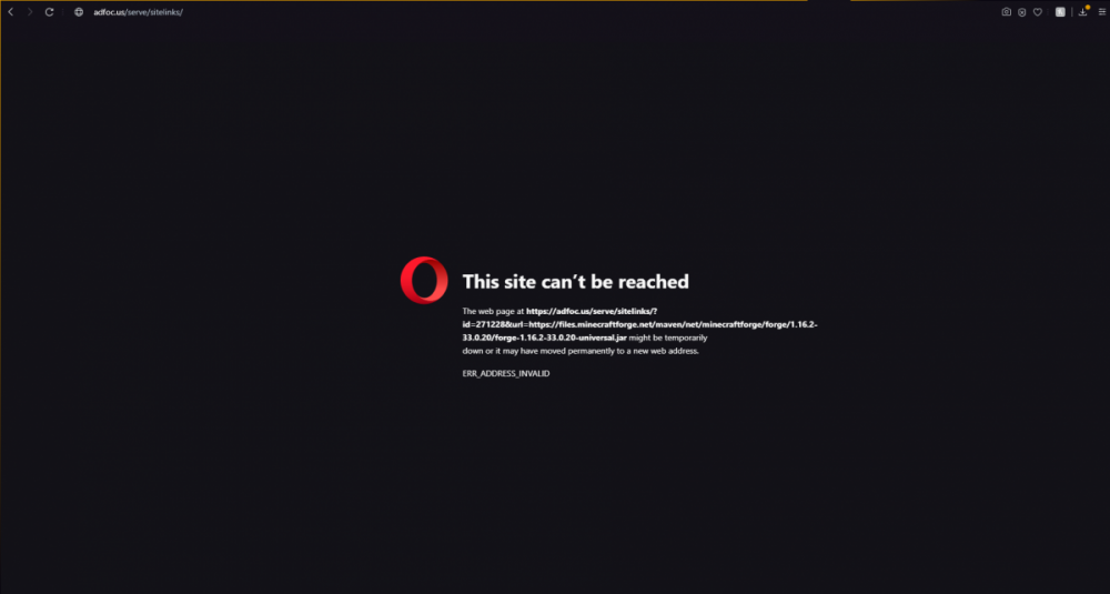 This site can’t be reached The web page at https://adfoc.us/serve/sitelinks/?id=271228&url=https://files.minecraftforge.net/maven/net/minecraftforge/forge/1.15.2-31.1.0/forge-1.15.2-31.1.0-mdk.zip might be temporarily down or it may have moved permanently to a new web address. ERR_ADDRESS_INVALID i use opera GX and this happens but the same happens with other browsers including firefox