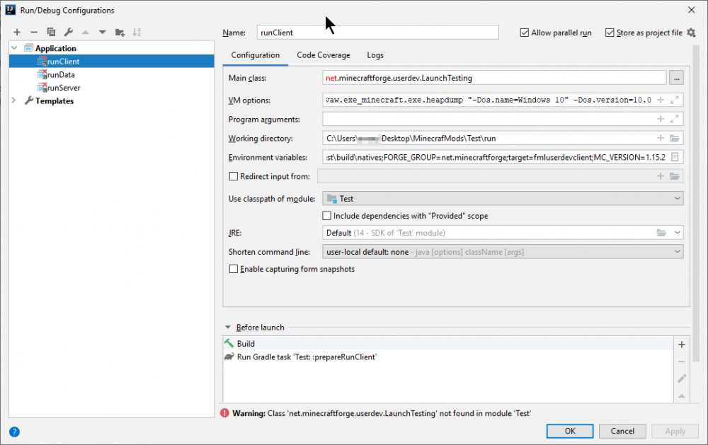On the runClient configuration appears that: Warning: Class 'net.minecraftforge.userdev.LaunchTesting' not found in module 'Test' (Test is the name of my module)