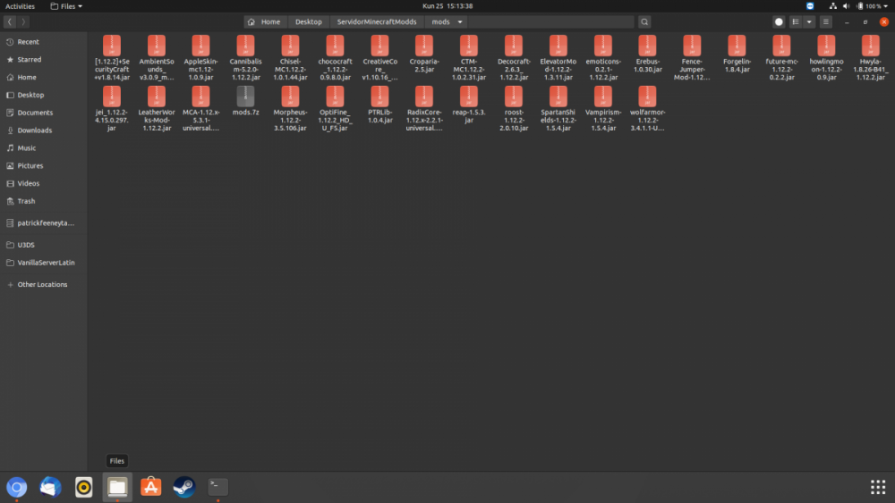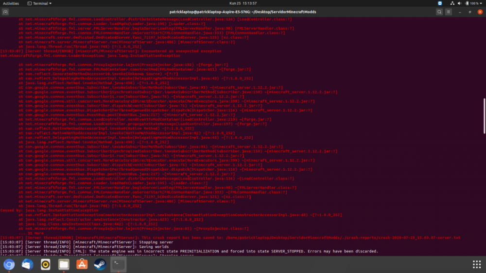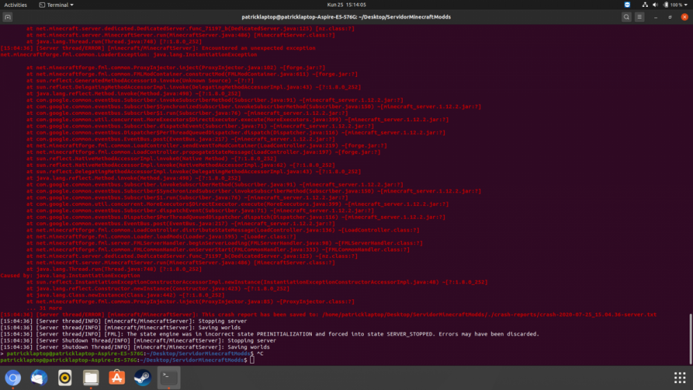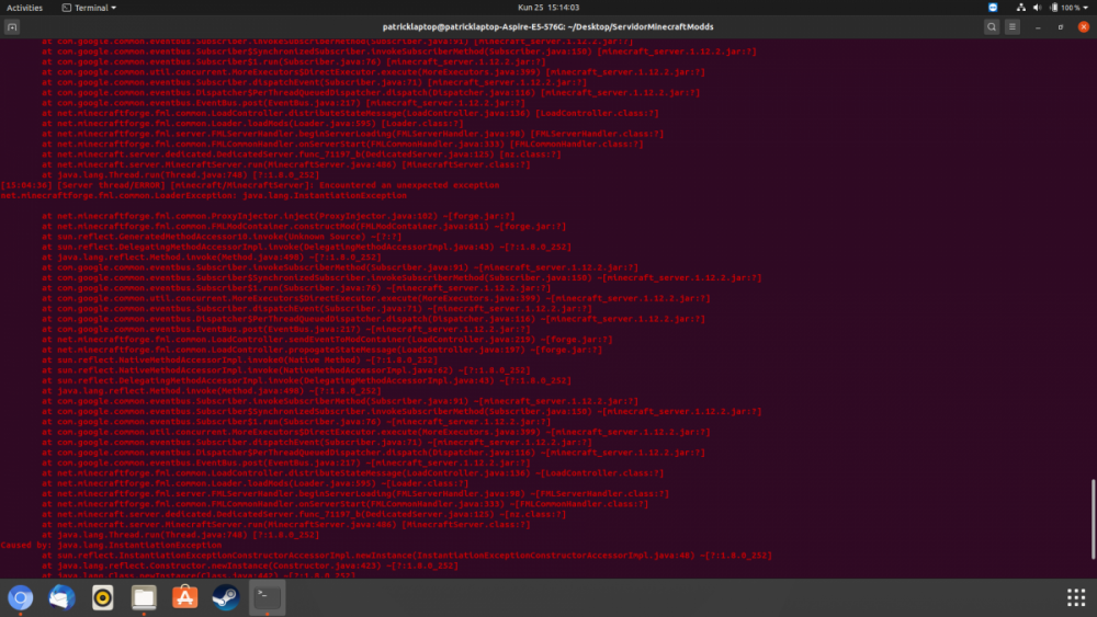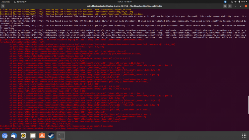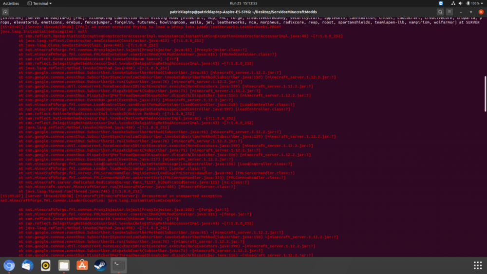 Hi guys, I've made many Minecraft sever before, but without mods I think. Now when I'm trying to create one in my laptop with ubuntu I get this. My laptop has an I5 8250U, 16 gb ddr3 ram, 256 ssd, 1th hdd and mx150. Thats not the problem I think... What could be happening? The mods I used are Securyty Craft, AmbientSounds, appleskin, cannibalism, chisel, chococraft, creativecore,croparia, ctmmc, decocraft, elevator, emoticons, erebus, fencejumper, forgelin, futuremc, howlingmoon, hwyla, jei, leatherworks, mca, morpheus, optifine, ptrlib, radixcore, reap, roost, spartanshields, vampirism, wolfarmor. And the version of forge is 1.12.2 stable. [15:02:54] [main/INFO] [LaunchWrapper]: Loading tweak class name net.minecraftforge.fml.common.launcher.FMLServerTweaker [15:02:54] [main/INFO] [LaunchWrapper]: Using primary tweak class name net.minecraftforge.fml.common.launcher.FMLServerTweaker [15:02:54] [main/INFO] [LaunchWrapper]: Calling tweak class net.minecraftforge.fml.common.launcher.FMLServerTweaker [15:02:54] [main/INFO] [FML]: Forge Mod Loader version 14.23.5.2854 for Minecraft 1.12.2 loading [15:02:54] [main/INFO] [FML]: Java is OpenJDK 64-Bit Server VM, version 1.8.0_252, running on Linux:amd64:5.4.0-42-generic, installed at /usr/lib/jvm/java-8-openjdk-amd64/jre [15:02:54] [main/INFO] [FML]: Searching /home/patricklaptop/Desktop/ServidorMinecraftModds/./mods for mods [15:02:54] [main/WARN] [FML]: Found FMLCorePluginContainsFMLMod marker in CreativeCore_v1.10.16_mc1.12.2.jar. This is not recommended, @Mods should be in a separate jar from the coremod. [15:02:54] [main/WARN] [FML]: The coremod com.creativemd.creativecore.core.CreativePatchingLoader does not have a MCVersion annotation, it may cause issues with this version of Minecraft [15:02:54] [main/WARN] [FML]: The coremod CreativePatchingLoader (com.creativemd.creativecore.core.CreativePatchingLoader) is not signed! [15:02:54] [main/WARN] [FML]: Found FMLCorePluginContainsFMLMod marker in CTM-MC1.12.2-1.0.2.31.jar. This is not recommended, @Mods should be in a separate jar from the coremod. [15:02:54] [main/WARN] [FML]: The coremod team.chisel.ctm.client.asm.CTMCorePlugin does not have a MCVersion annotation, it may cause issues with this version of Minecraft [15:02:54] [main/WARN] [FML]: The coremod CTMCorePlugin (team.chisel.ctm.client.asm.CTMCorePlugin) is not signed! [15:02:54] [main/WARN] [FML]: Found FMLCorePluginContainsFMLMod marker in emoticons-0.2.1-1.12.2.jar. This is not recommended, @Mods should be in a separate jar from the coremod. [15:02:54] [main/WARN] [FML]: The coremod EmoticonsCore (mchorse.emoticons.core.EmoCoreMod) is not signed! [15:02:54] [main/WARN] [FML]: Found FMLCorePluginContainsFMLMod marker in Forgelin-1.8.4.jar. This is not recommended, @Mods should be in a separate jar from the coremod. [15:02:54] [main/WARN] [FML]: The coremod net.shadowfacts.forgelin.preloader.ForgelinPlugin does not have a MCVersion annotation, it may cause issues with this version of Minecraft [15:02:54] [main/WARN] [FML]: The coremod ForgelinPlugin (net.shadowfacts.forgelin.preloader.ForgelinPlugin) is not signed! [15:02:54] [main/WARN] [FML]: Found FMLCorePluginContainsFMLMod marker in future-mc-1.12.2-0.2.2.jar. This is not recommended, @Mods should be in a separate jar from the coremod. [15:02:54] [main/WARN] [FML]: The coremod FutureMC (thedarkcolour.futuremc.asm.CoreLoader) is not signed! [15:02:54] [main/INFO] [FML]: Loading tweaker optifine.OptiFineForgeTweaker from OptiFine_1.12.2_HD_U_F5.jar [15:02:54] [main/INFO] [FML]: Loading tweaker org.spongepowered.asm.launch.MixinTweaker from wolfarmor-1.12.2-3.4.1.1-UNIVERSAL-signed.jar [15:02:54] [main/INFO] [LaunchWrapper]: Loading tweak class name net.minecraftforge.fml.common.launcher.FMLInjectionAndSortingTweaker [15:02:54] [main/INFO] [LaunchWrapper]: Loading tweak class name optifine.OptiFineForgeTweaker [15:02:54] [main/INFO] [LaunchWrapper]: Loading tweak class name org.spongepowered.asm.launch.MixinTweaker [15:02:54] [main/INFO] [mixin]: SpongePowered MIXIN Subsystem Version=0.7.10 Source=file:/home/patricklaptop/Desktop/ServidorMinecraftModds/./mods/wolfarmor-1.12.2-3.4.1.1-UNIVERSAL-signed.jar Service=LaunchWrapper Env=SERVER [15:02:54] [main/INFO] [mixin]: Compatibility level set to JAVA_8 [15:02:54] [main/INFO] [LaunchWrapper]: Loading tweak class name net.minecraftforge.fml.common.launcher.FMLDeobfTweaker [15:02:54] [main/INFO] [LaunchWrapper]: Calling tweak class net.minecraftforge.fml.common.launcher.FMLInjectionAndSortingTweaker [15:02:54] [main/INFO] [LaunchWrapper]: Calling tweak class net.minecraftforge.fml.common.launcher.FMLInjectionAndSortingTweaker [15:02:54] [main/INFO] [LaunchWrapper]: Calling tweak class optifine.OptiFineForgeTweaker [15:02:54] [main/INFO] [STDOUT]: [optifine.OptiFineForgeTweaker:dbg:56]: OptiFineForgeTweaker: acceptOptions [15:02:54] [main/INFO] [STDOUT]: [optifine.OptiFineForgeTweaker:dbg:56]: OptiFineForgeTweaker: Forge server detected, skipping class transformer [15:02:54] [main/INFO] [LaunchWrapper]: Calling tweak class net.minecraftforge.fml.relauncher.CoreModManager$FMLPluginWrapper [15:02:56] [main/INFO] [FML]: Found valid fingerprint for Minecraft Forge. Certificate fingerprint e3c3d50c7c986df74c645c0ac54639741c90a557 [15:02:56] [main/INFO] [LaunchWrapper]: Calling tweak class net.minecraftforge.fml.relauncher.CoreModManager$FMLPluginWrapper [15:02:56] [main/INFO] [LaunchWrapper]: Calling tweak class net.minecraftforge.fml.relauncher.CoreModManager$FMLPluginWrapper [15:02:56] [main/INFO] [LaunchWrapper]: Calling tweak class net.minecraftforge.fml.relauncher.CoreModManager$FMLPluginWrapper [15:02:56] [main/INFO] [LaunchWrapper]: Calling tweak class org.spongepowered.asm.launch.MixinTweaker [15:02:56] [main/INFO] [mixin]: Initialised Mixin FML Remapper Adapter with net.minecraftforge.fml.common.asm.transformers.deobf.FMLDeobfuscatingRemapper@6124287a [15:02:56] [main/INFO] [LaunchWrapper]: Calling tweak class net.minecraftforge