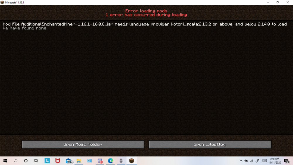 i have 1.16.1 java and i got a mod called AdditionalEnchantedMiner verison: https://www.curseforge.com/minecraft/mc-mods/additional-enchanted-miner/files/3030894 its 1.16.1 mod and when i launch i get this message