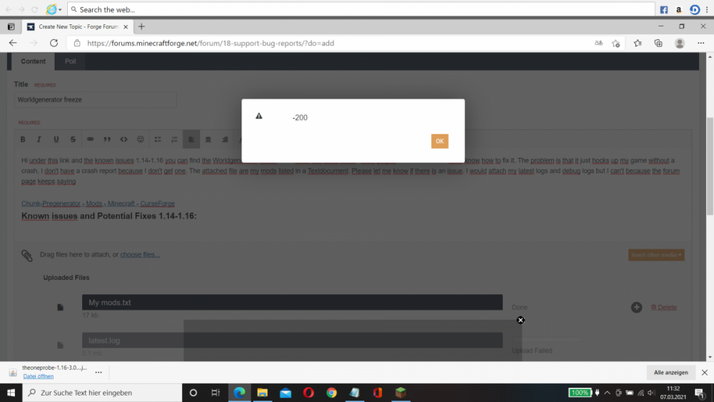Hi under this link and the known issues 1.14-1.16 you can find the Worldgenerator freeze tab. I have this issue since I have played on 1.16.4-5 and I don't know how to fix it. The problem is that it just hocks up my game without a crash, I don't have a crash report because I don't get one. The attached file are my mods listed in a Textdocument. Please let me know if there is an issue. I would attach my latest logs and debug logs but I can't because see attached image. Chunk-Pregenerator - Mods - Minecraft - CurseForge Known issues and Potential Fixes 1.14-1.16: My mods.txt