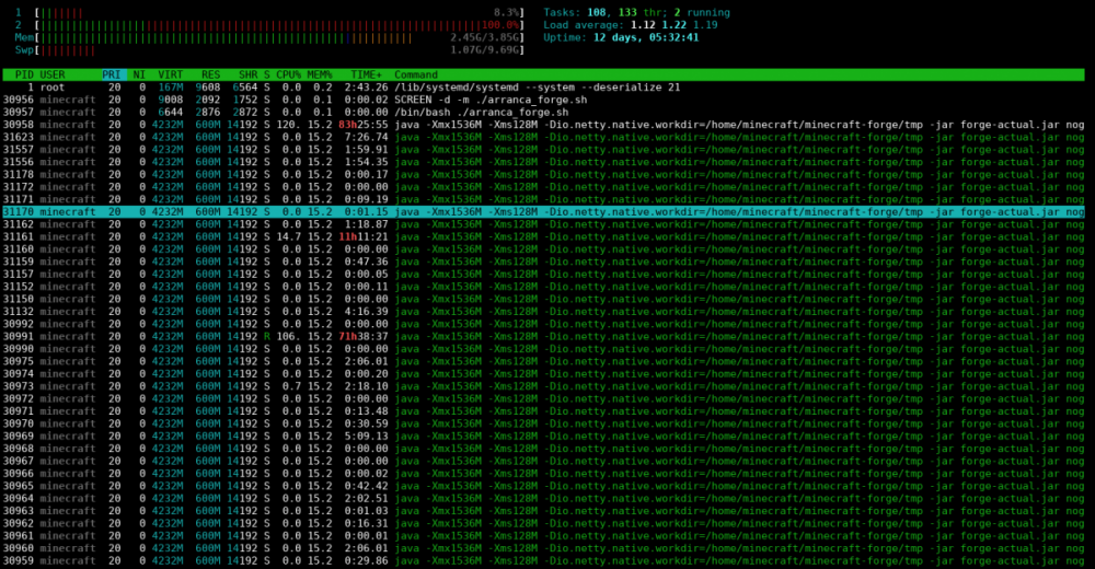 5. On my up-to-date debian buster server installation: # cat /etc/debian_version 10.7 # java --version openjdk 11.0.9.1 2020-11-04 OpenJDK Runtime Environment (build 11.0.9.1+1-post-Debian-1deb10u2) OpenJDK 64-Bit Server VM (build 11.0.9.1+1-post-Debian-1deb10u2, mixed mode, sharing) # apt-cache policy openjdk-11-jre-headless openjdk-11-jre-headless: Instalados: 11.0.9.1+1-1~deb10u2 Candidato: 11.0.9.1+1-1~deb10u2 Tabla de versión: *** 11.0.9.1+1-1~deb10u2 500 500 http://debian.redimadrid.es/debian buster/main amd64 Packages 100 /var/lib/dpkg/status 11.0.9+11-1~deb10u1 500 500 http://security.debian.org/debian-security buster/updates/main amd64 Packages # uname -a Linux eneri 4.19.0-14-amd64 #1 SMP Debian 4.19.171-2 (2021-01-30) x86_64 GNU/Linux model name : AMD Athlon(tm) 64 X2 Dual Core Processor 4400+ cpu MHz : 2200.000 Minecraft 1.16.5, Forge 36.0.13. I've also tried previous forge versions (all of them 36.0.x) with the same result When running vanilla server, two java threads are using around 10-20% CPU time when no players are connected. Almost all of this CPU time is user CPU time Same scenario with forge 36.0, one java thread is using around 10-20% CPU, but another one is always using 100% of one complete core with around 75% sys (kern) CPU time I've straced the problematic java thread, and it's running this syscall clock_gettime(CLOCK_MONOTONIC, {tv_sec=204463, tv_nsec=427087879}) = 0 around 11900 times a second. Is this behavior normal with forge installed or is it a bug ?